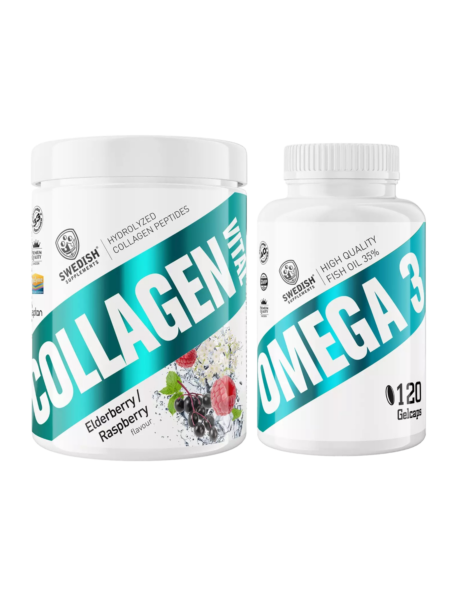 Collagen Vital 400g och Omega 3 – 120 kapslar i ett rabatterat paket. En smart kombination av kosttillskott för dig som vill stärka och förbättra hudens kvalitet till ett bättre pris.